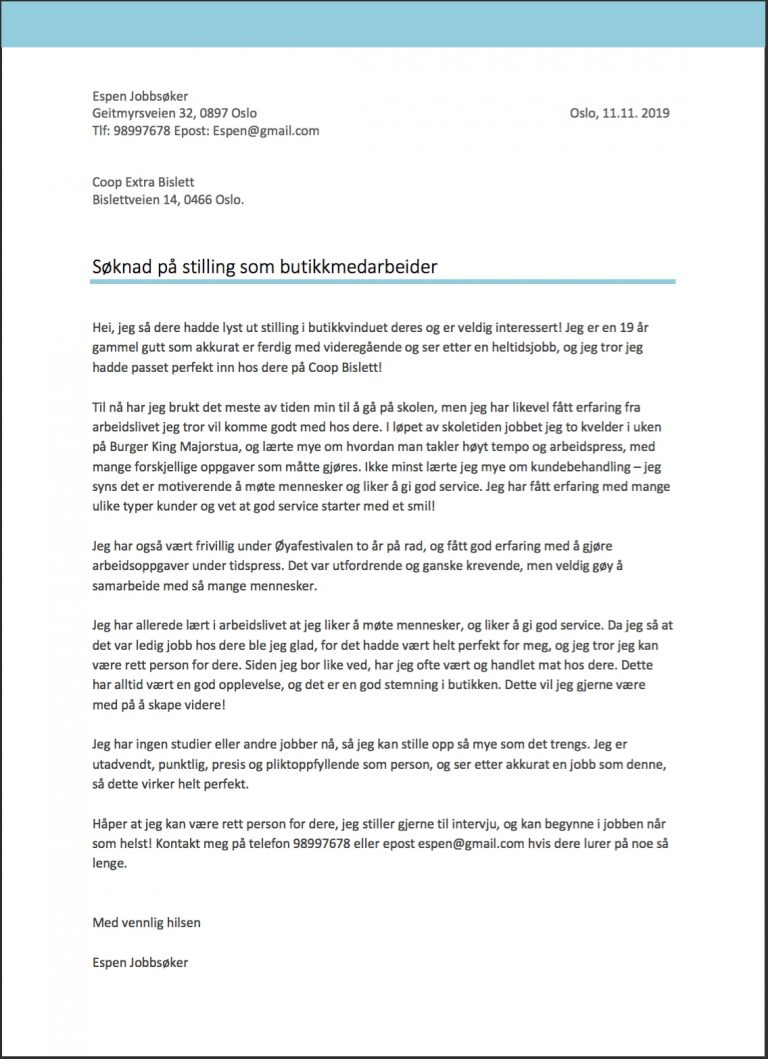 Z kolei podanie o pracę (søknad) powinno być napisane opisowo. Podanie musi zawierać uzasadnienie dlaczego jesteśmy zainteresowani danym stanowiskiem i dlaczego warto nas wybrać. W podaniu możemy także opisać nasze osiągnięcia i plany zawodowe oraz od kiedy możemy zacząć pracę i w jakim wymiarze godzin. Przykładowe podanie o pracę: