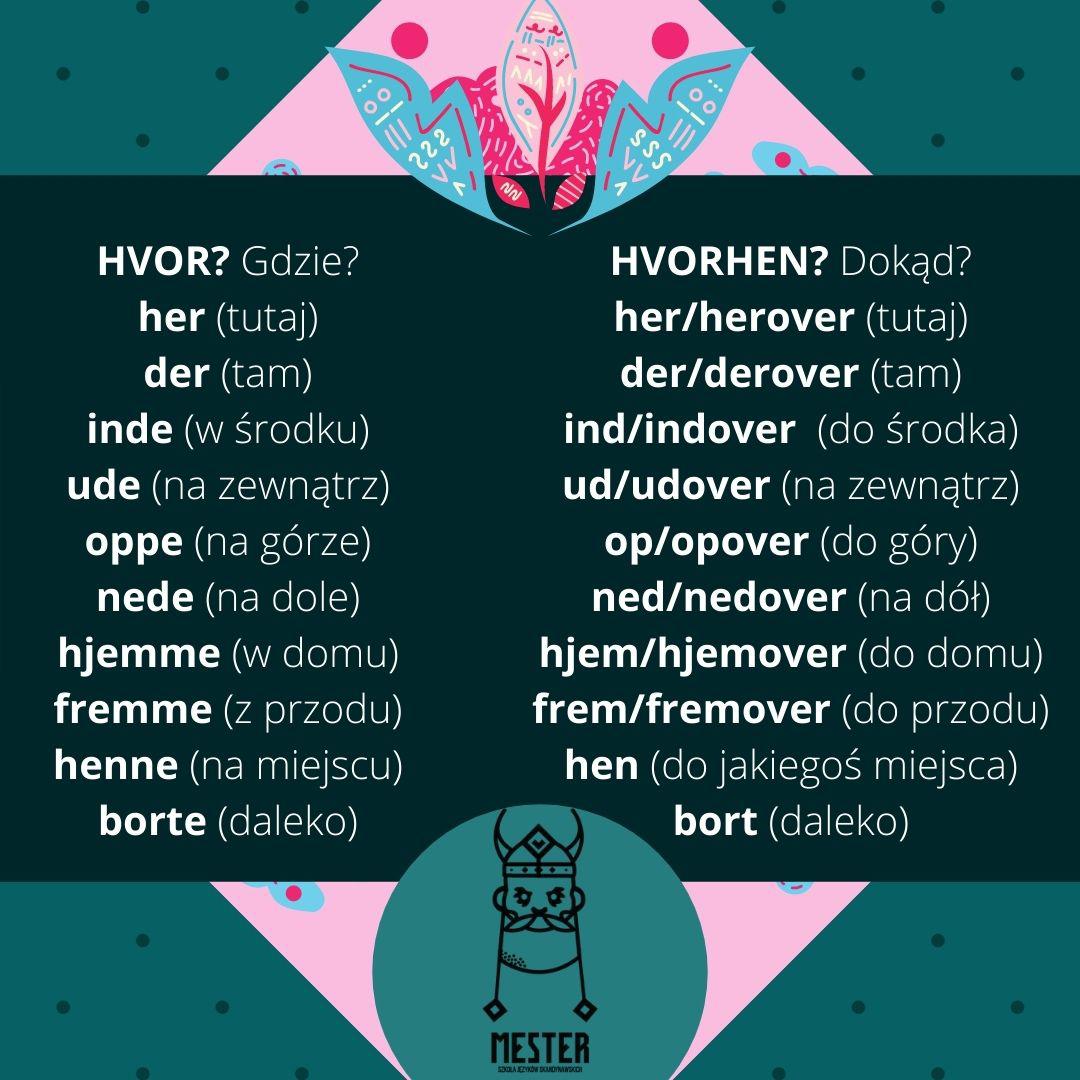 Przysłówki miejsca mogą mieć kilka różnych form, które odpowiadają odpowiednio na pytania gdzie? (hvor?), skąd? (hvorfra?) lub dokąd? (hvorhen?).